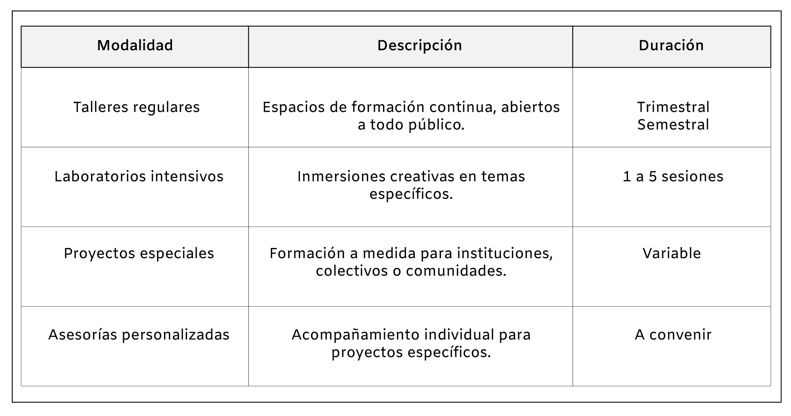 Nuestra metodología formativa parte de la observación activa y el diálogo horizontal como puntos de partida. Cada taller o laboratorio se estructura como un proceso vivo donde la exploración sensible precede a la técnica: primero despertamos la mirada, luego acompañamos el manejo de materiales y lenguajes. Trabajamos a través de proyectos individuales y colectivos, lo que permite que cada participante avance a su ritmo mientras aprende en comunidad. El error es bienvenido como parte del aprendizaje, y la reflexión permanente sobre lo creado alimenta nuevos caminos.
